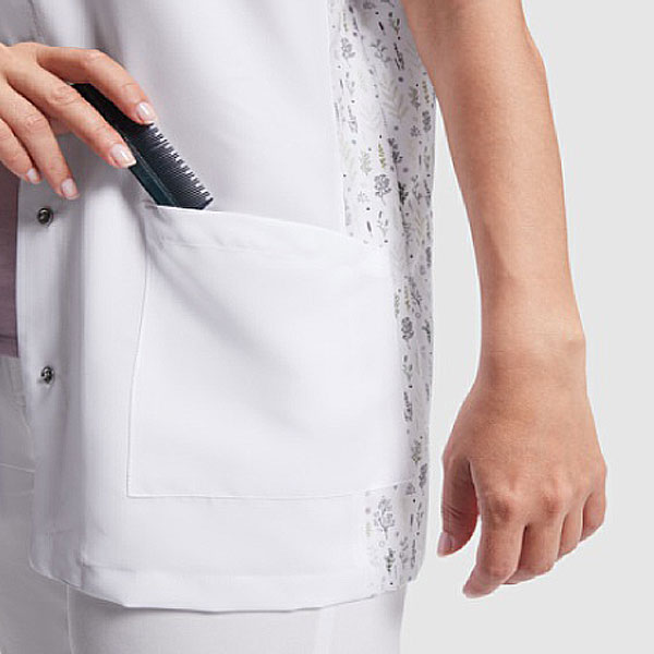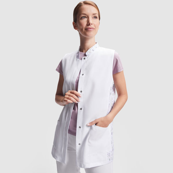 Ligera y práctica, esta bata sin mangas ofrece libertad de movimiento y un ajuste favorecedor gracias a sus costadillos laterales y pinzas de pecho. Con cuello mao, cierre oculto con botones automáticos y dos bolsillos de parche frontales. Tejido 100% poliéster, fácil de lavar y secado rápido. Disponible de la talla XS a 3XL.